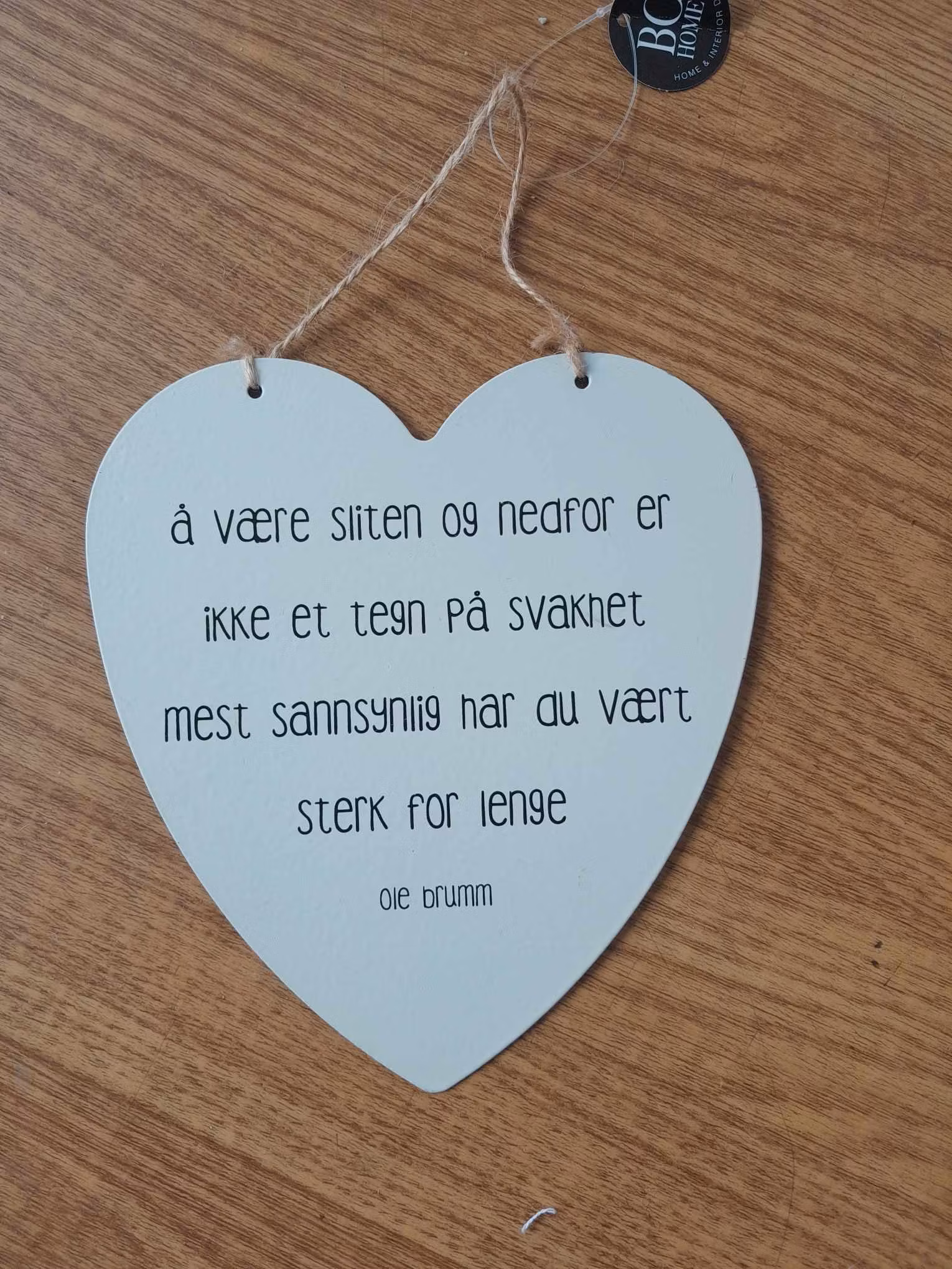 Hjerteskilt - sitat fra Ole Brumm 75,- Koselig hjerteskilt med hyssing-oppheng i metall.Teksten er et sitat fra Ole BrummMål: 17x16cm Produktet finnes dessverre ikke på lager. Del Informasjon Tilbakemeldinger Koselig hjerteskilt med hyssing-oppheng i metall.Teksten er et sitat fra Ole BrummMål: 17x16cm