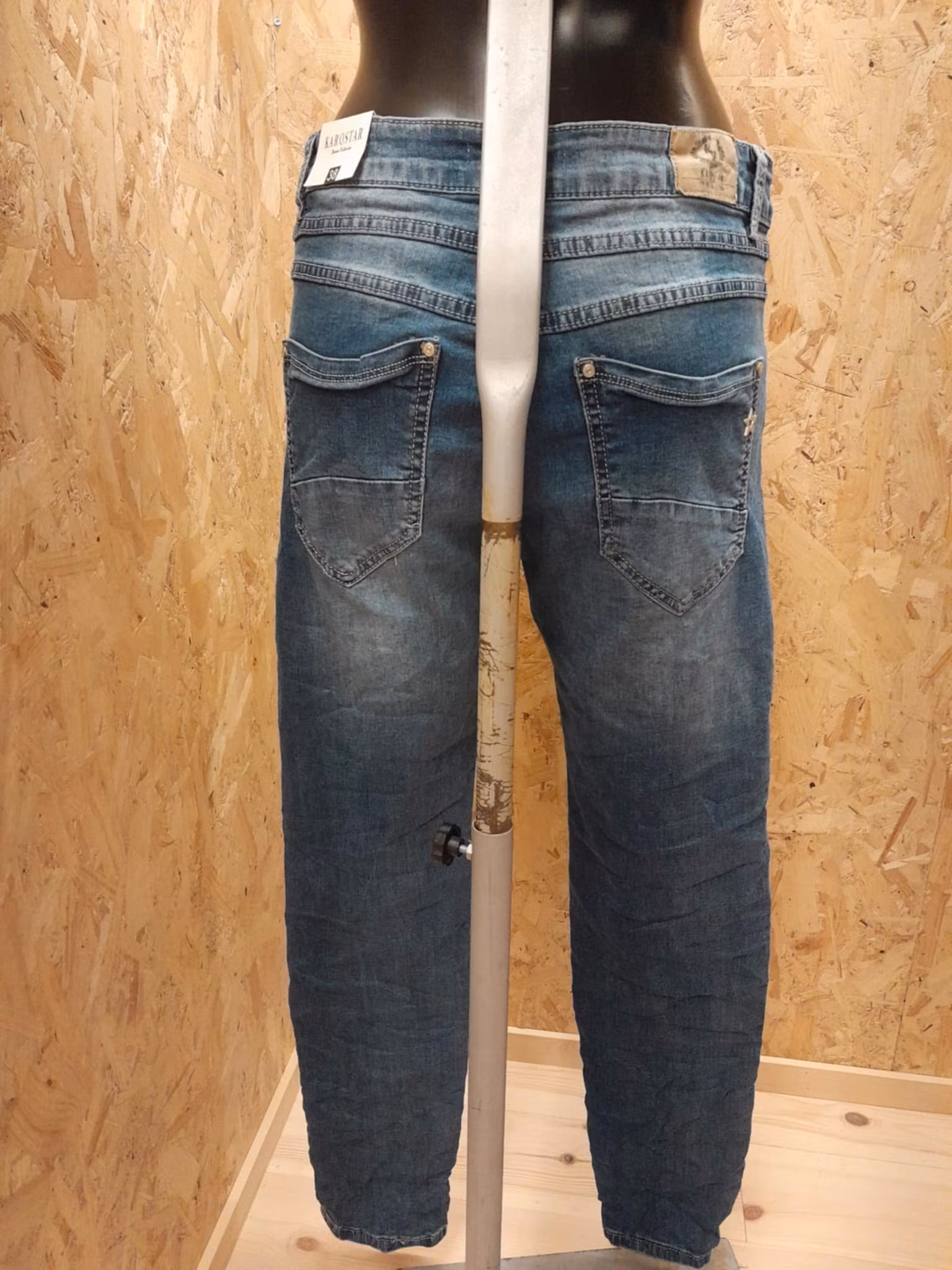 Denne trendy KAROSTAR jeansen med stilige patch-detaljer kombinerer rLff design med superstretch-materiale for optimal komfort. Den har en romslig passform, og vi anbefaler å velge én størrelse mindre enn vanlig for perfekt fit.